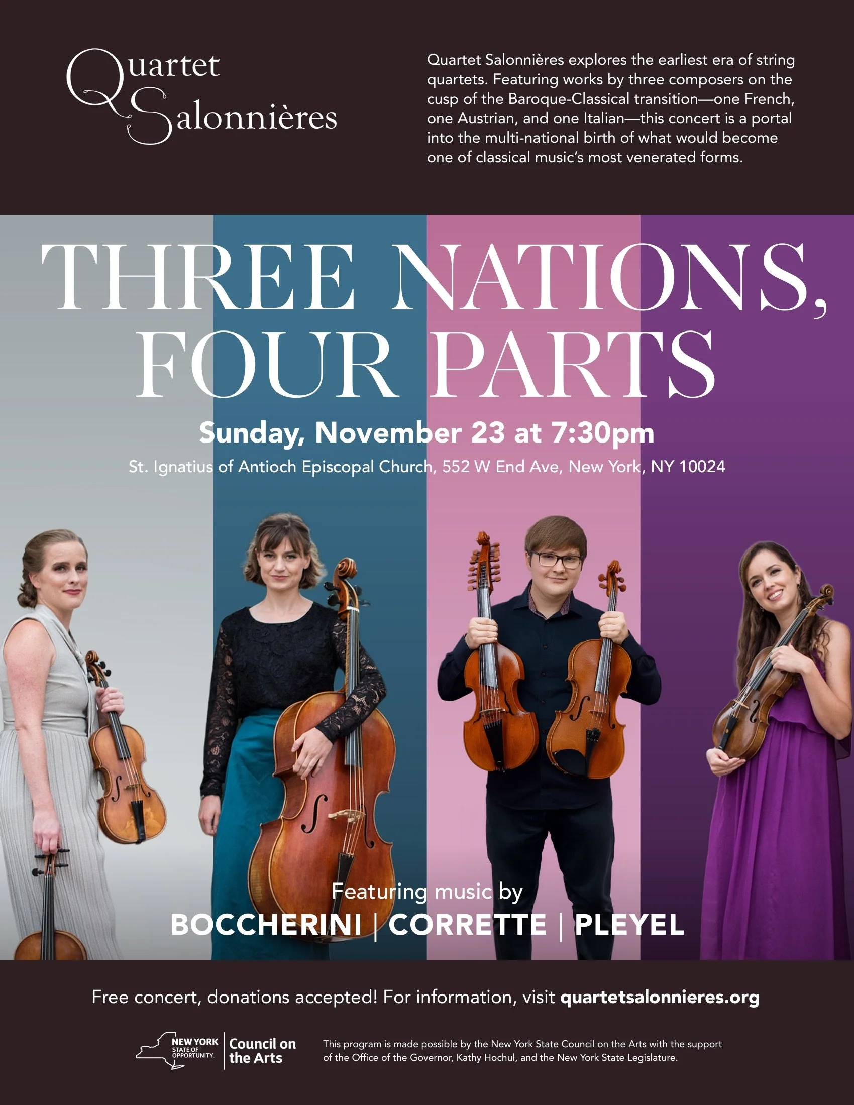 Quartet Salonnières explores the earliest era of string quartets. Featuring works by three composers on the cusp of the Baroque-Classical transition - one French, one Austrian, and one Italian - this concert is a portal into the multi-national birth of what would become one of classical music’s most venerated forms.